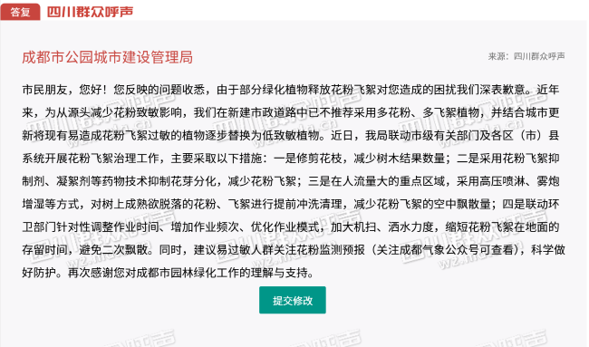 2月24日,成都市公园城市建设管理局在四川群众呼声回应了饱受花粉过敏困扰的网民们。