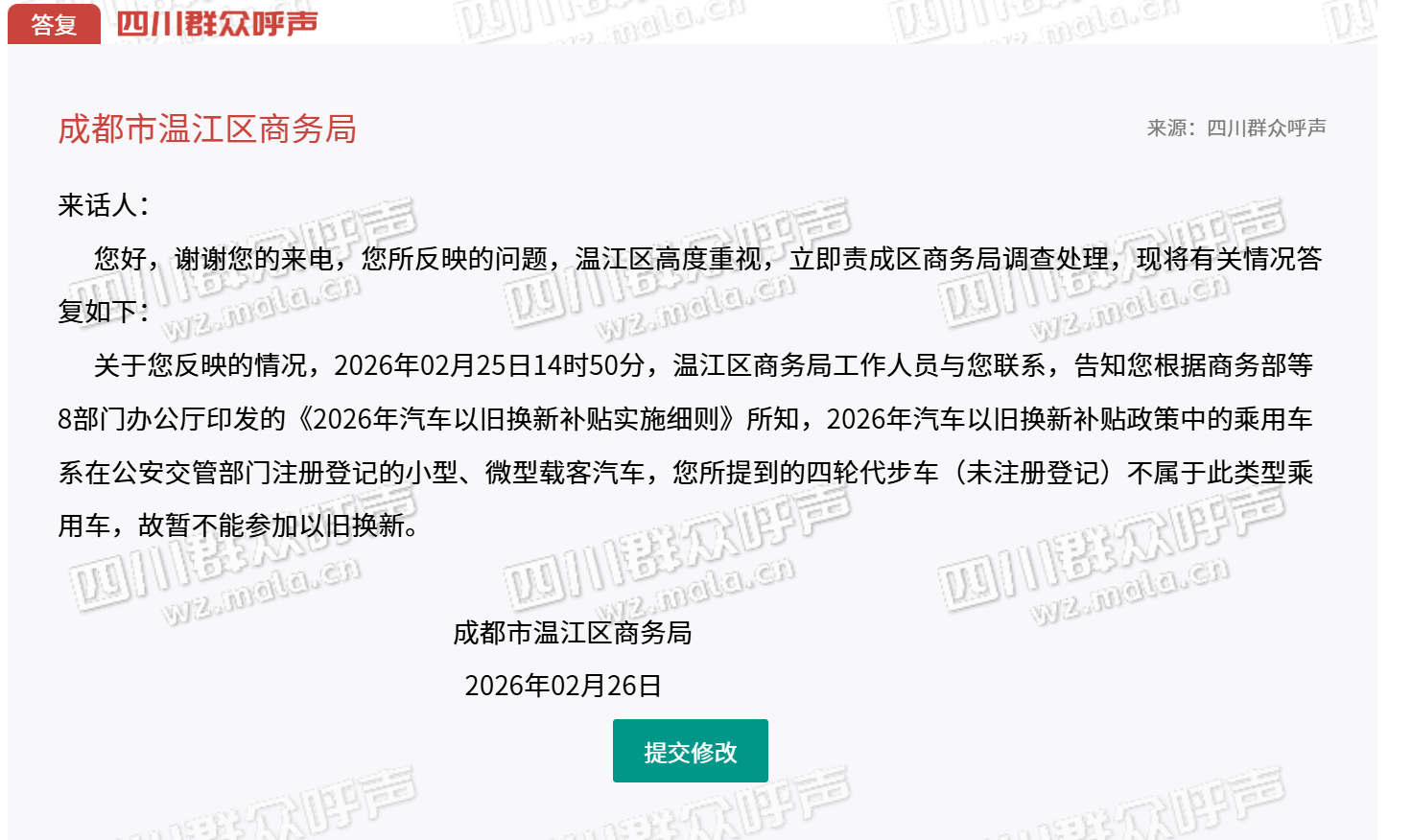 成都市温江区商务局回复:根据商务部等8部门办公厅印发的《2026年汽车以旧换新补贴实施细则》所知,2026年汽车以旧换新补贴政策中的乘用车系在公安交管部门注册登记的小型、微型载客汽车,四轮代步车(未注册登记)不属于此类型乘用车,故暂不能参加以旧换新。