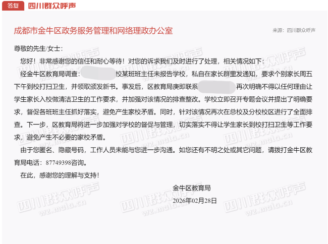 金牛区教育局回复:某学校某班班主任未报告学校,私自在家长群里发通知,要求个别家长周五下午到校打扫卫生,并领取颁发新书。事发后,立即联系学校,再次明确不得以任何理由让学生家长入校做清洁卫生的工作要求,并加强对该情况的排查整改。学校立即召开专题会议并提出了明确要求,督促各班班主任抓好落实,避免产生家校矛盾。同时,针对该情况再次在总校及分校校区进行了全面排查。下一步,区教育局将进一步加强对学校的督促与管理,切实落实不得让学生家长到校打扫卫生等工作要求,避免产生不必要的家校矛盾。