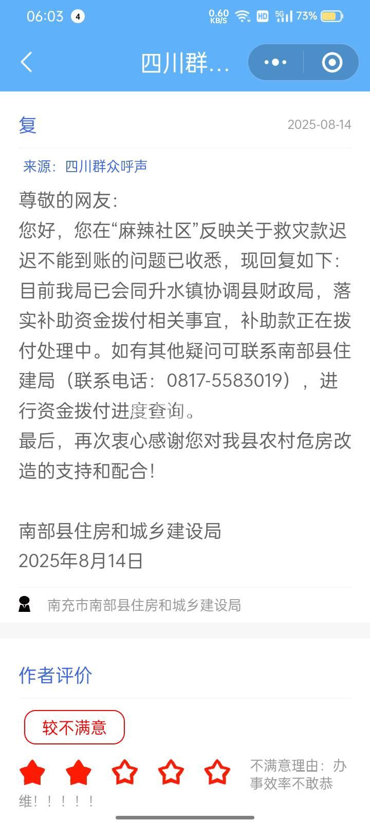 南充市政管局已接收,转派至南部县委书记信箱