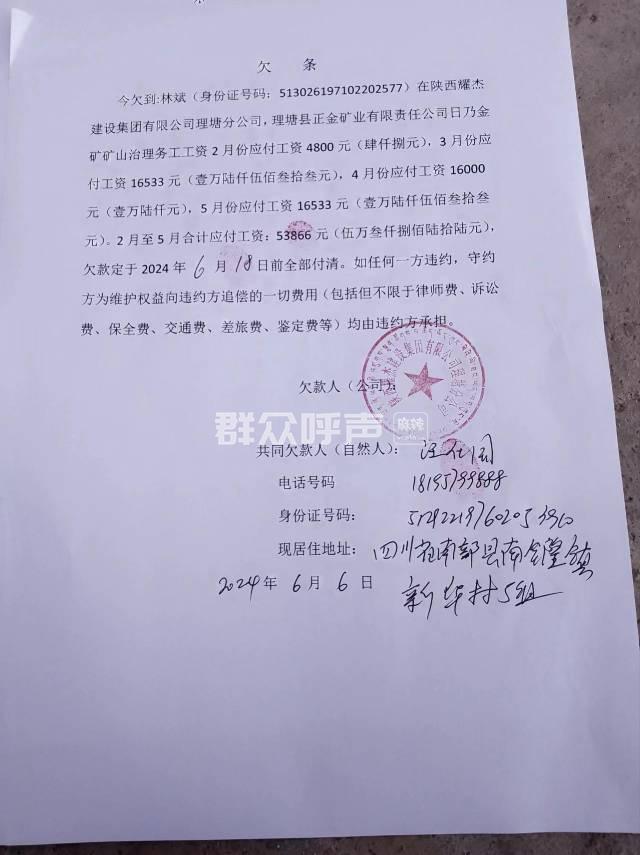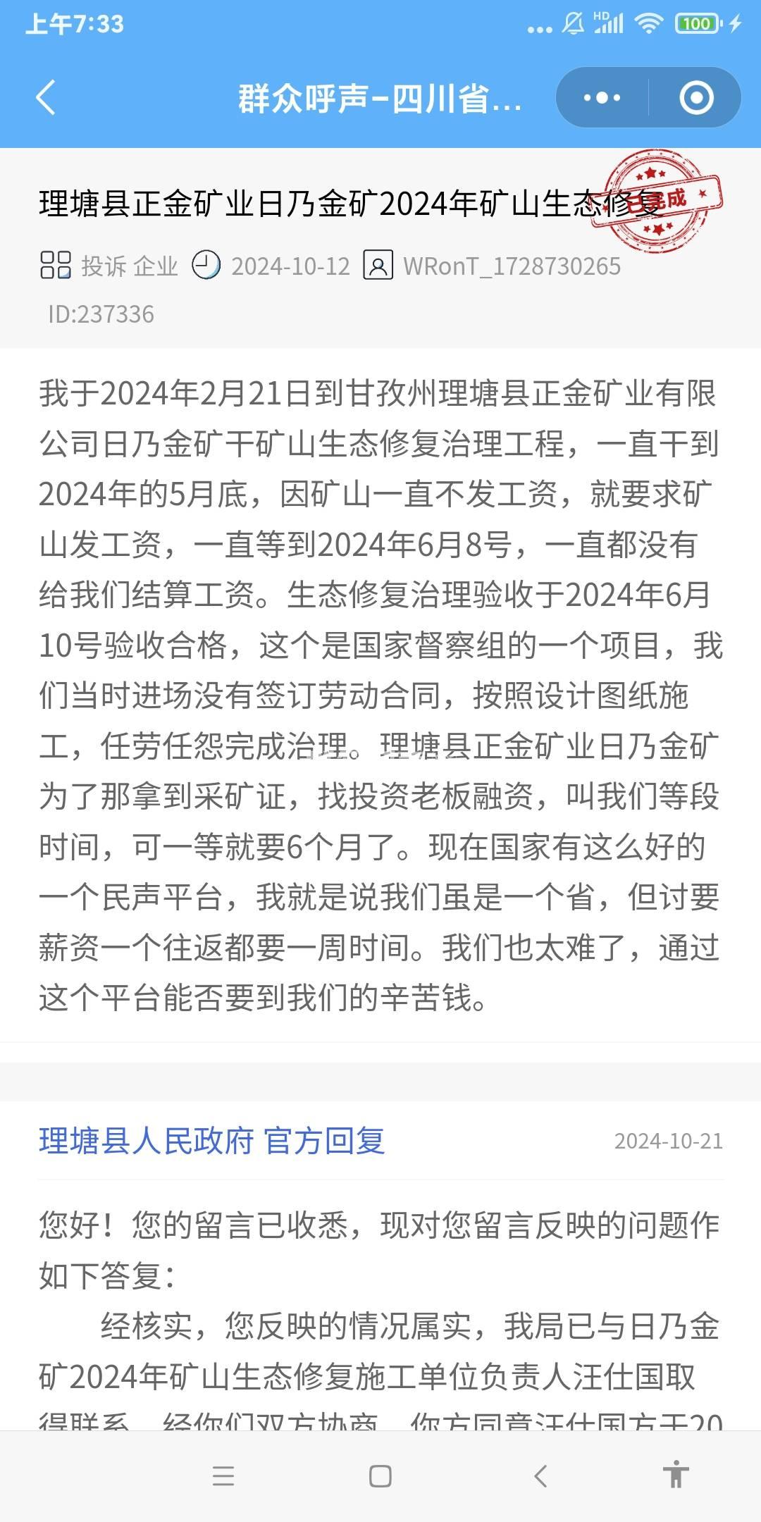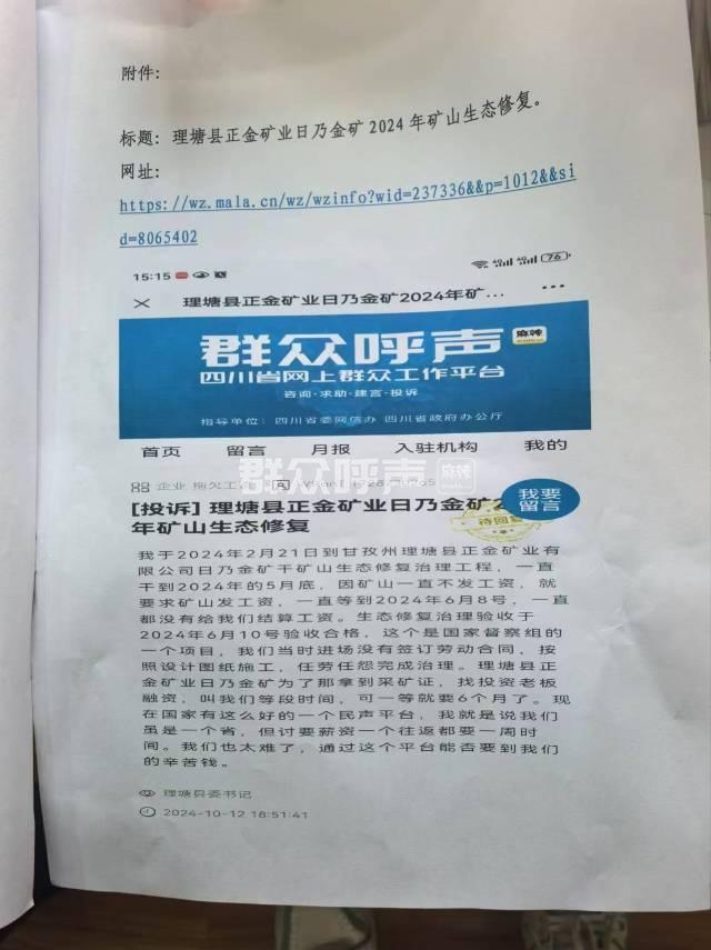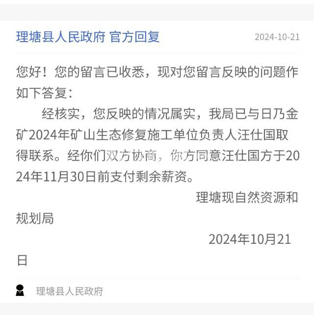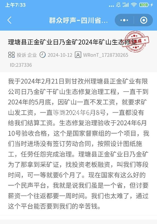 [投诉] 理塘县正金矿业日奶金矿2024年生态修复欠薪