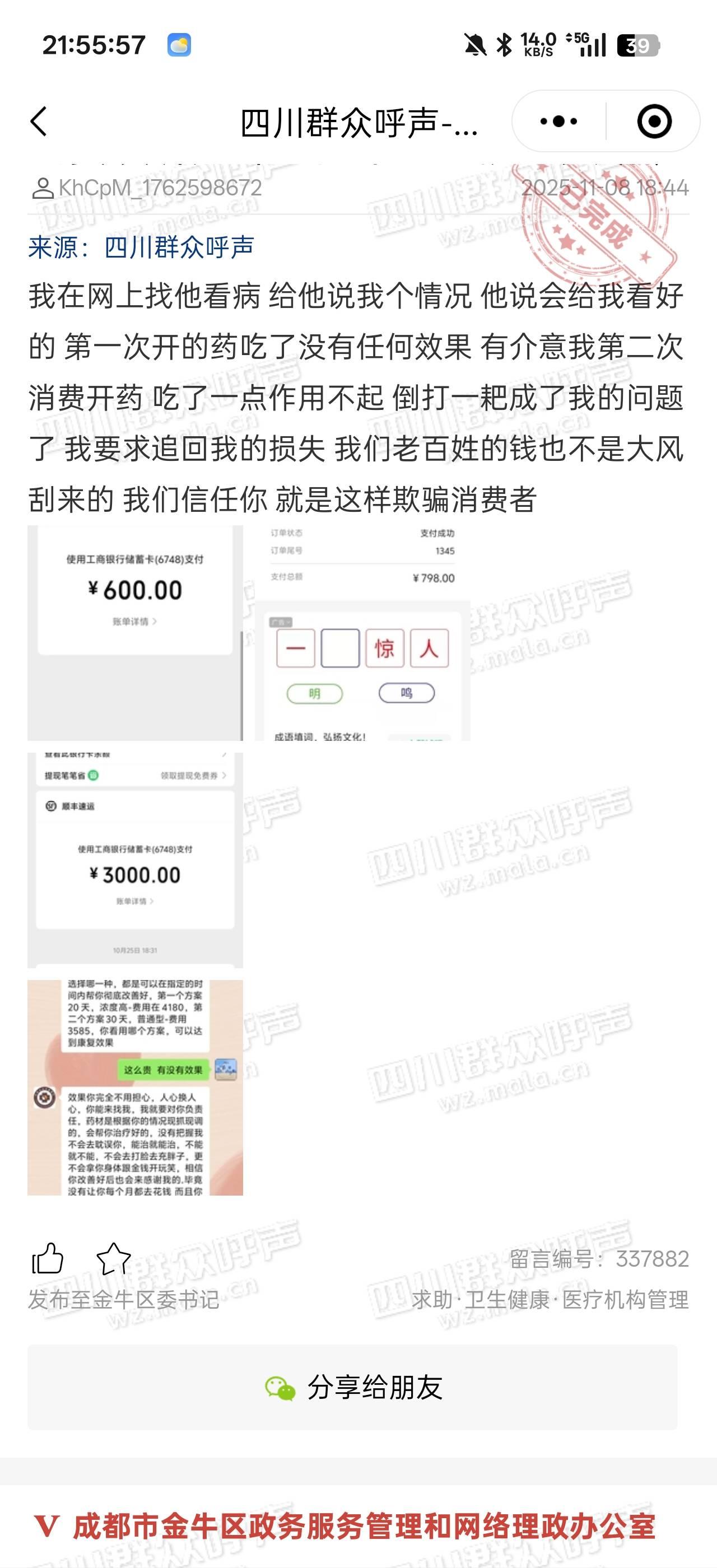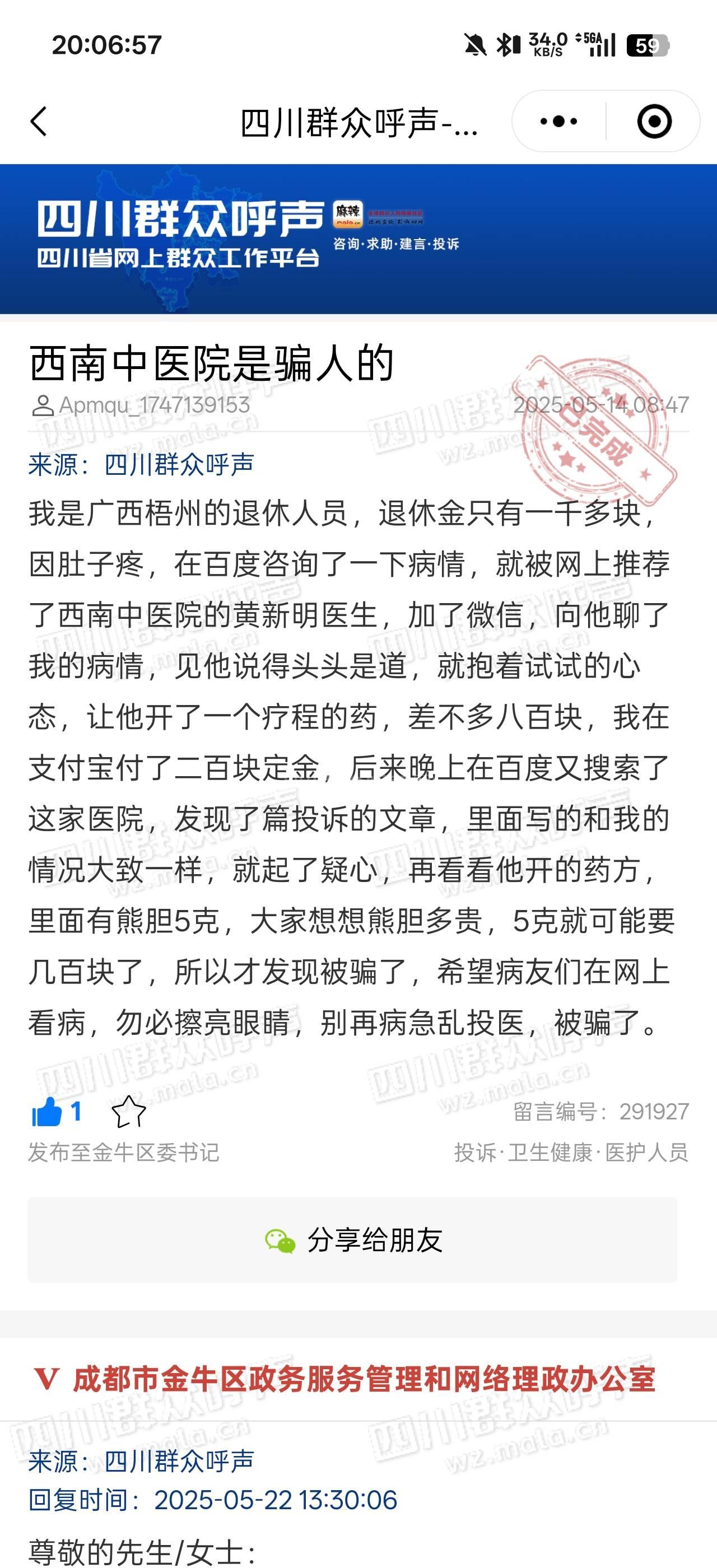 成都市城市运行和政务服务办已接收,转派至金牛区委书记信箱