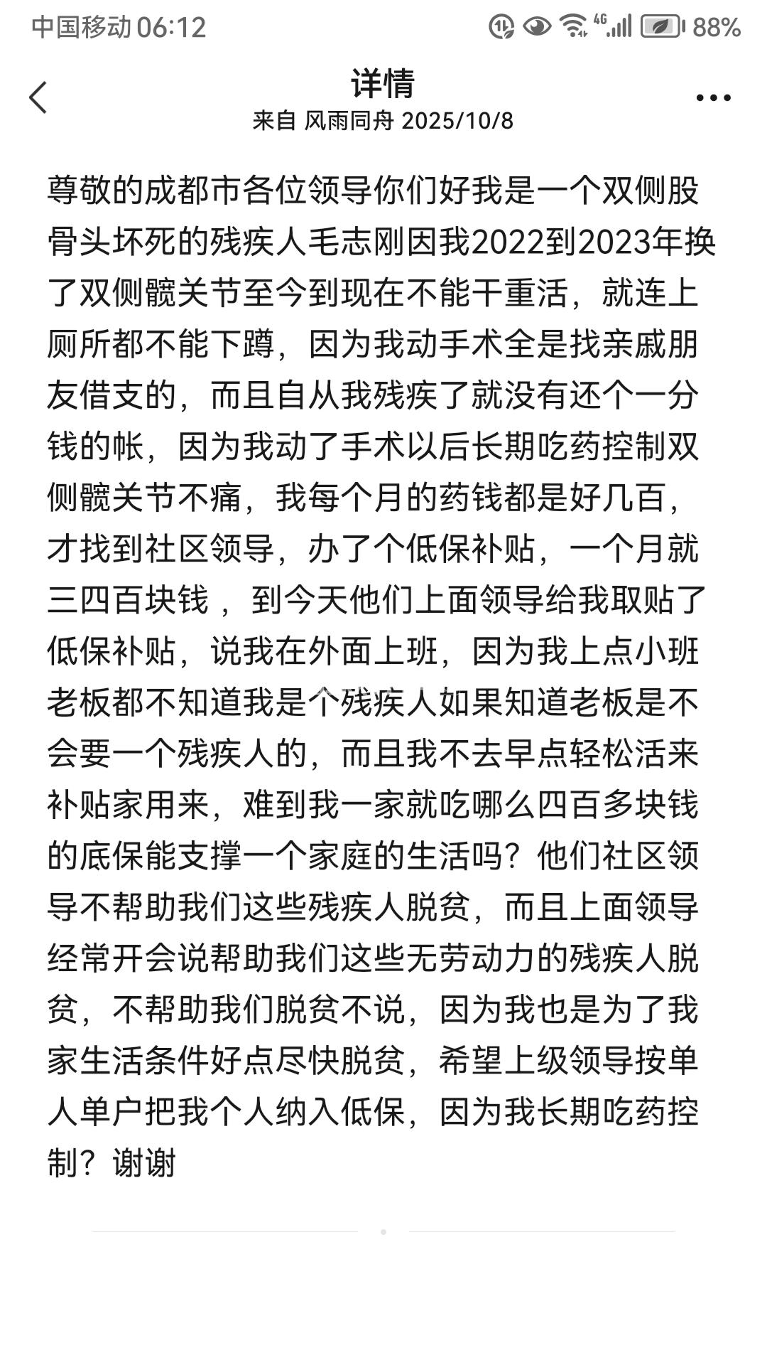 [求助] 残三级残疾人股骨头髋关节坏死低保补贴