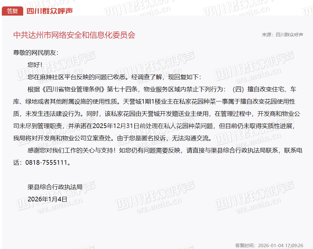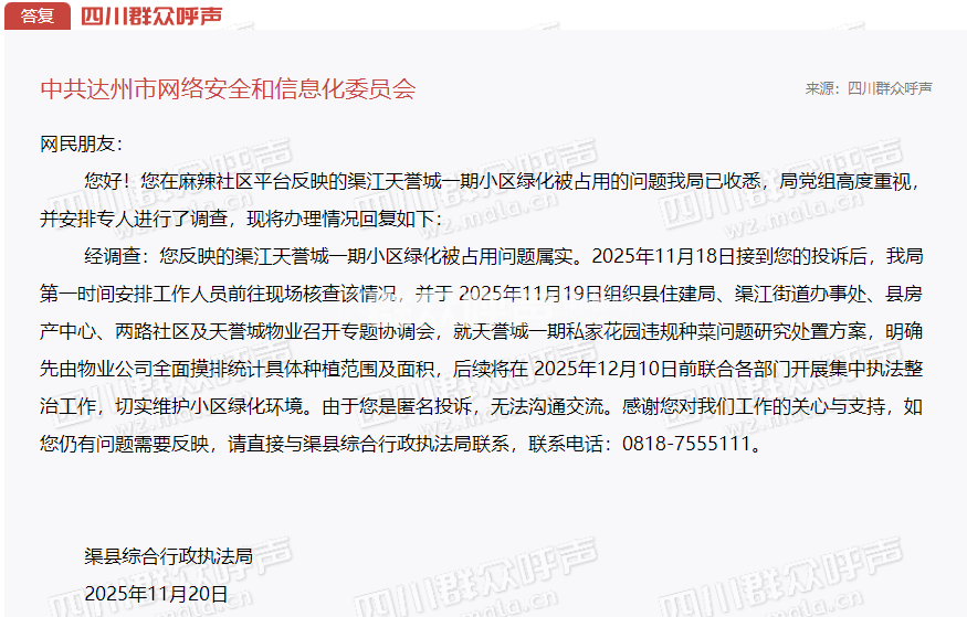 住房和城乡建设厅转派至达州市