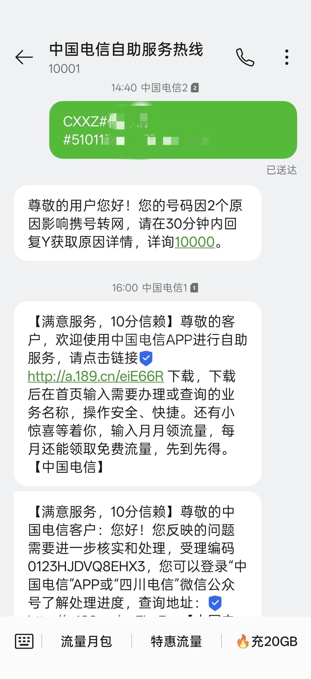 [投诉] 四川电信,发送携号转网短信名下手机号被停机