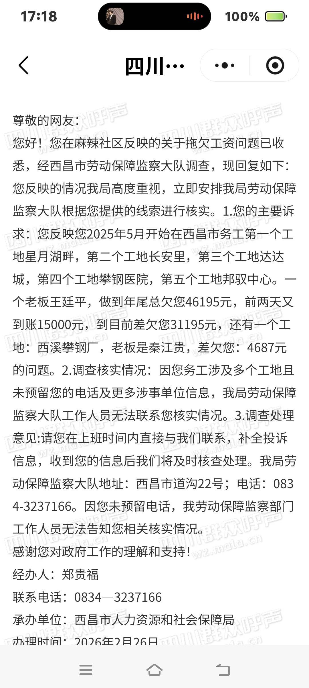 凉山州政府办已接收,转派至西昌市委书记信箱