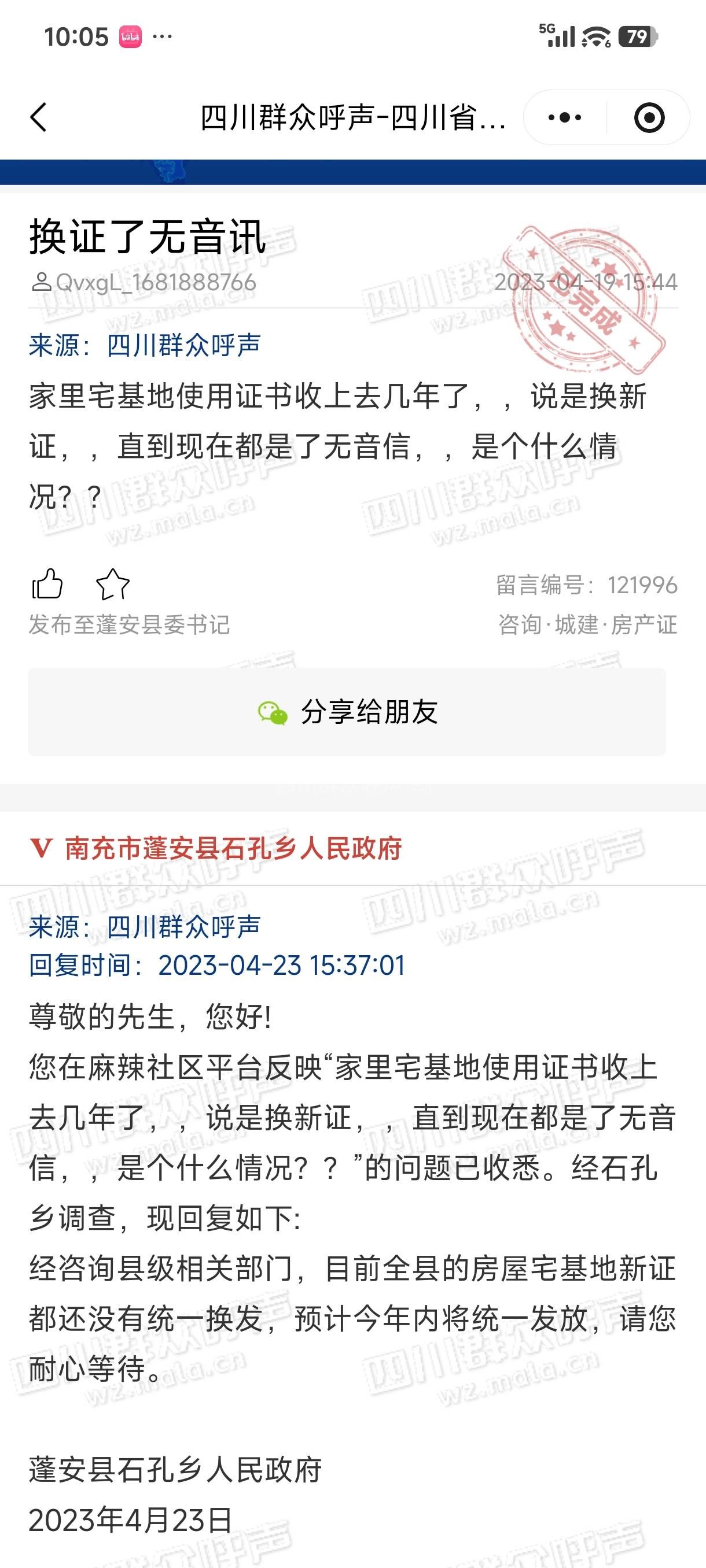 南充市政管局已接收,转派至蓬安县委书记信箱