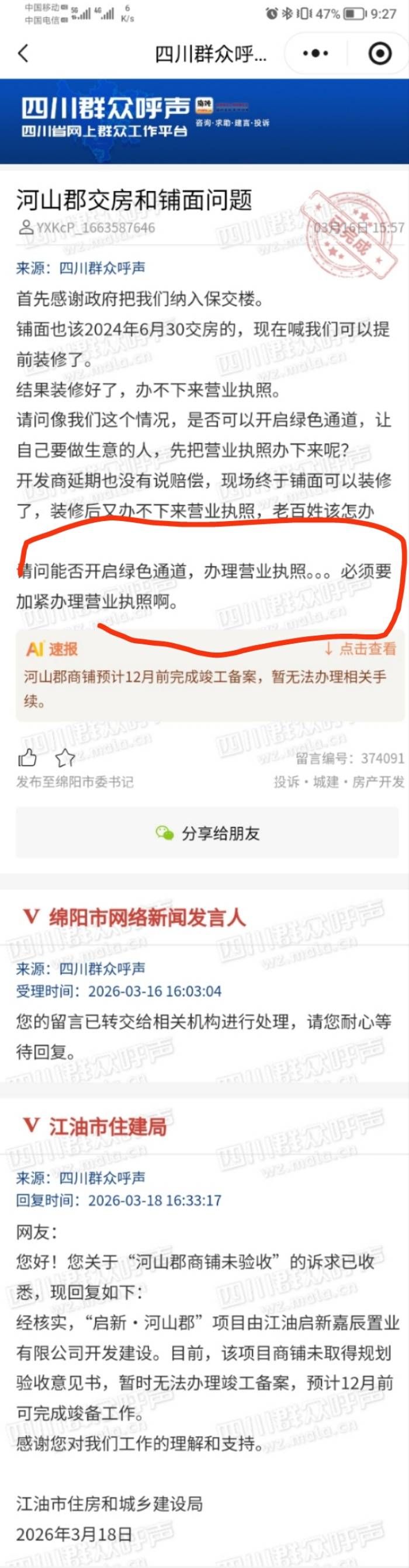 请正面回答 已办结 投诉