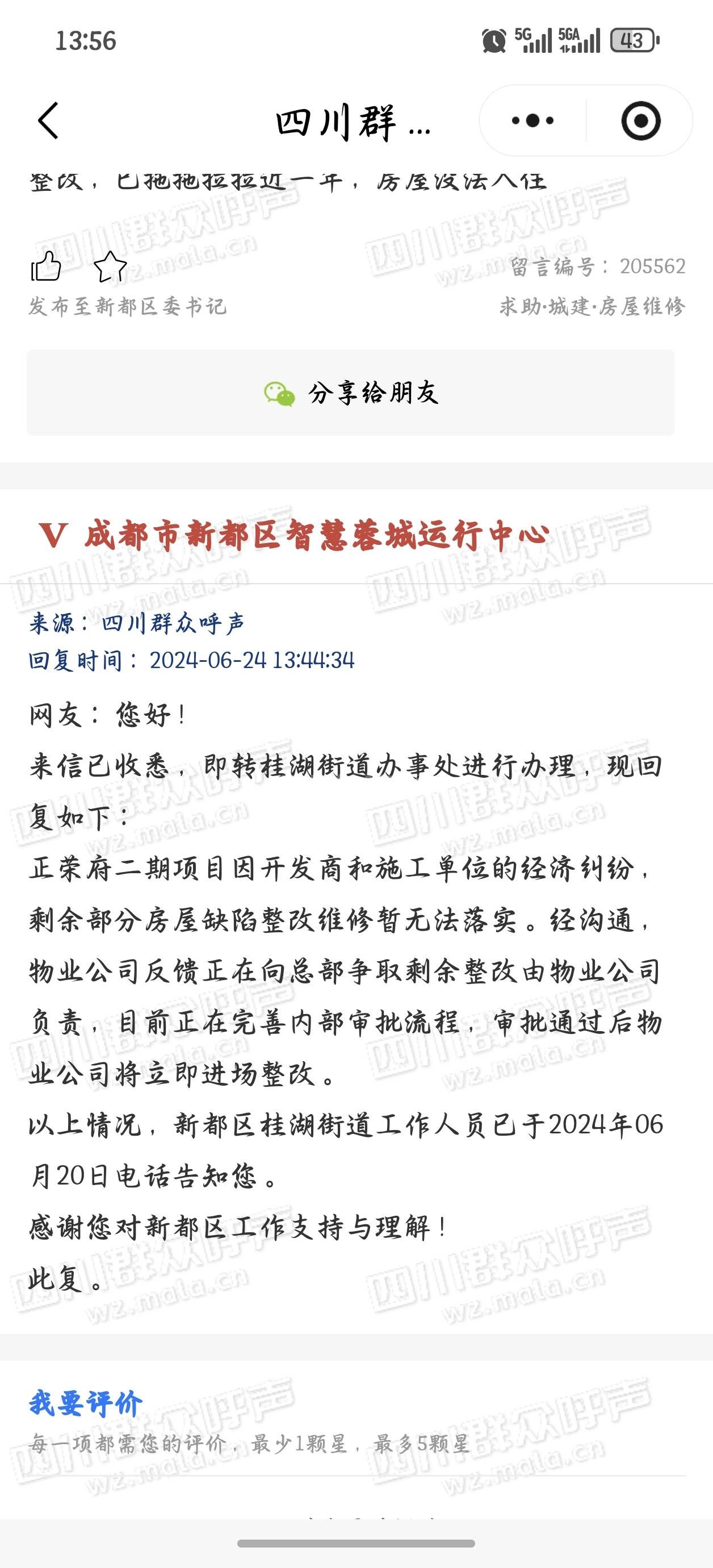 住房和城乡建设厅转派至成都市