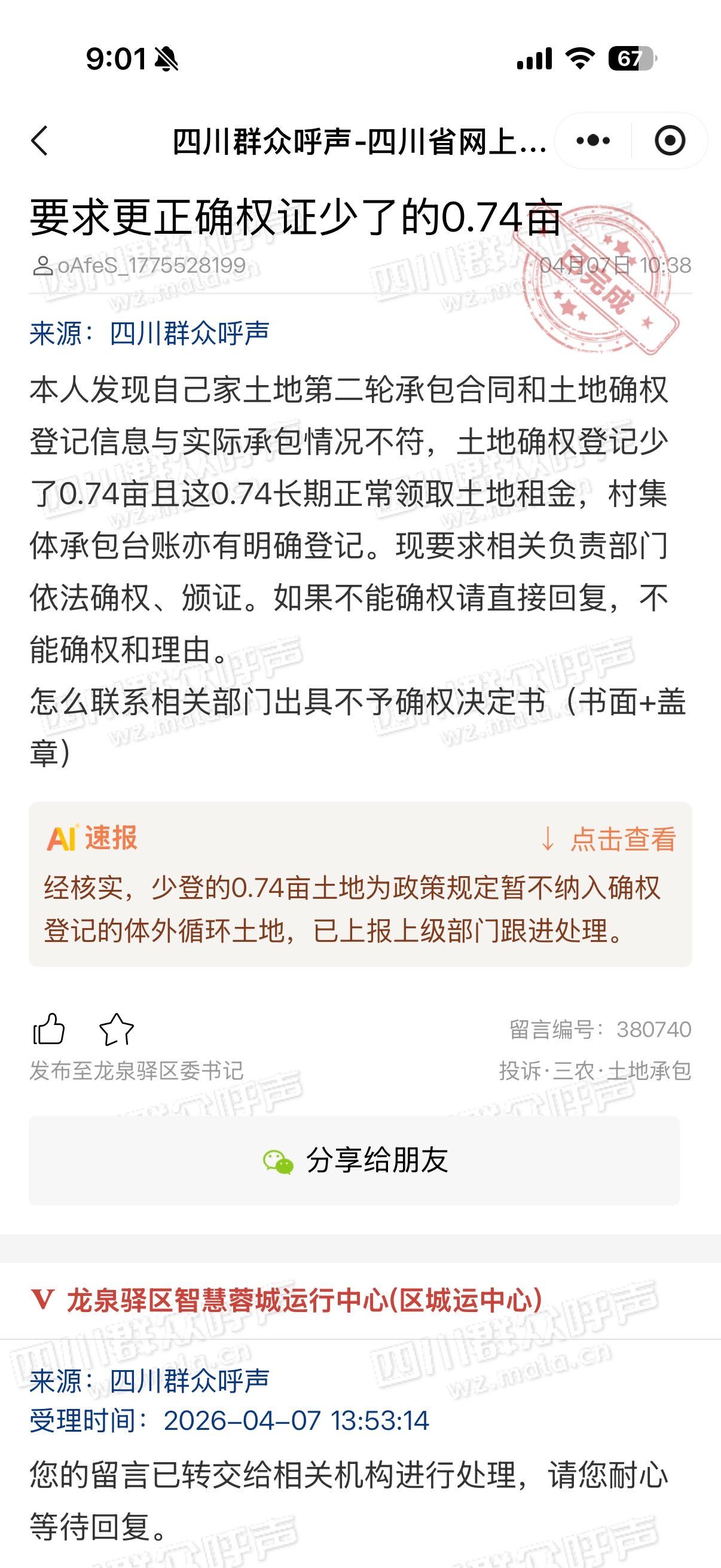 土地确权登记错误 已受理 投诉