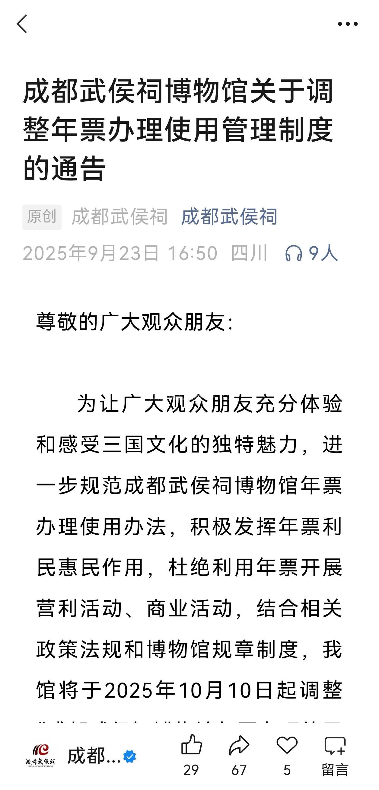 [建言] 希望成都武侯祠年票开通线上办理